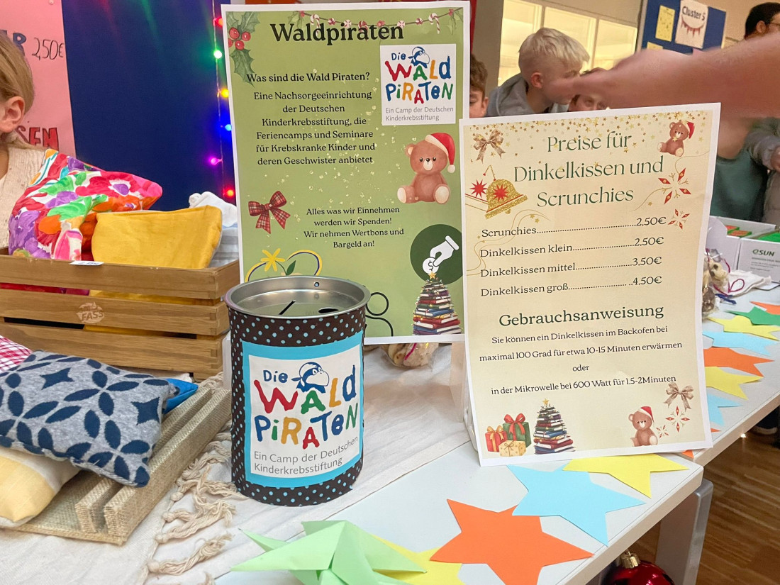 Sieben Wochen lang haben wir unsere Zeit in die Herstellung von Scrunchies und Dinkelkissen investiert, um diese an unserem Winterzauber erfolgreich verkaufen zu können. Die Einnahmen möchten wir persönlich an die Waldpiraten übergeben. In den Scrunchies und Dinkelkissen steckt viel Liebe und Arbeit. Das Projekt hat uns eine riesige Freude gemacht und wir haben beim Winterzauber eine erfreuliche Summe eingenommen,  die wir nun an die Waldpiraten spenden.