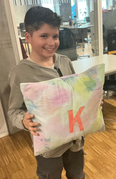 Zu Beginn haben die Inklusionsschüler:innen aus alten Bettlaken wunderschöne Stoffe gebatikt, die dann zur Herstellung der Hüllen dienten. Die Batik- Stoffe wurden im Rahmen des AES-Unterrichts unter Anleitung der ISP-Studentinnen zu Kissenhüllen vernäht und an die Fünftklässler:innen übergeben.
