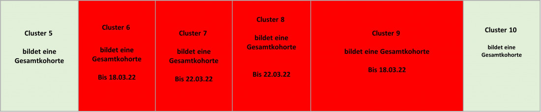 Rot hinterlegte Klassen befinden sich aktuell in Kohortenquarantäne. Hinter der Klasse finden Sie das Enddatum der Quarantänemaßnahmen.