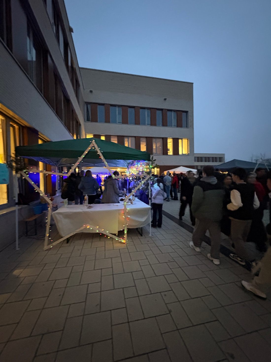 Den ganzen Vormittag wurde gebastelt, dekoriert und vorbereitet, damit am Nachmittag alles startklar ist. Dieses Mal gab es neben den vielen Ständen mit Essen und Getränken sowie Basteleien in der Aula auch ein Winterdorf auf dem Schulhof, wo sich weitere Leckereien und Aktivitäten fanden. Tannenbaum-Weitwurf zum Beispiel!